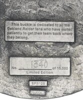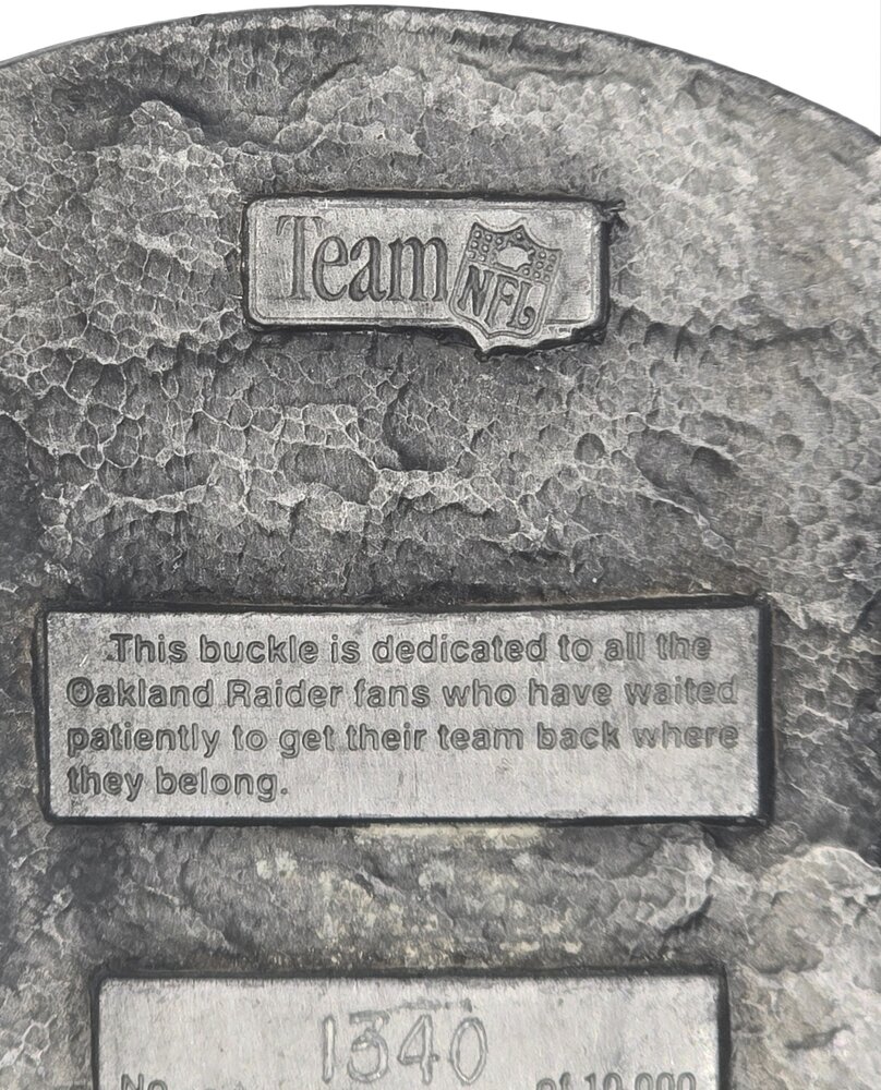 This buckle is dedicated to all the Oakland Raiders fans who have waited patiently to get their team back where they belong.